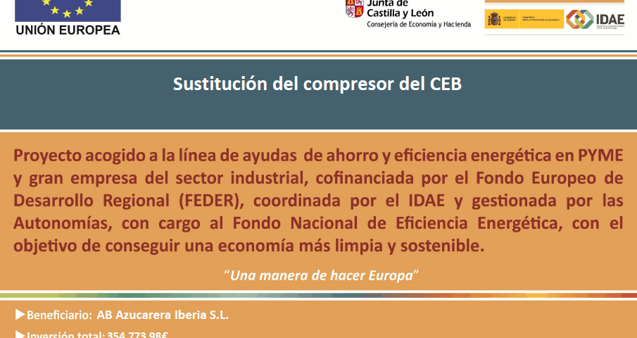Azucarera Iberia S.L. ha sido beneficiaria de las “Ayudas para actuaciones de eficiencia energética en PYME y gran empresa del sector industrial” para ejecutar el proyecto de Sustitución de compresor del Centro de Envasado de Benavente.